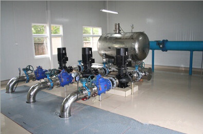 设备投入使用后,打开自来水进水阀门,自来水直接进入稳流调节器,称调节器内的空气从负压抑制器排出,待水充满后,负压抑制器自动关闭。当用户管网水压P3小于设定的恒定压力P4时,变频控制系统控制水泵启动运行,并根据用水量的大小自动调节水泵转速进行恒压供水,若变频水泵达到工频转速时,经过延时切换到工频运行同时再启动另一台水泵变频运转,以保证用户管网压力始终保持在设定压力P4数值上。