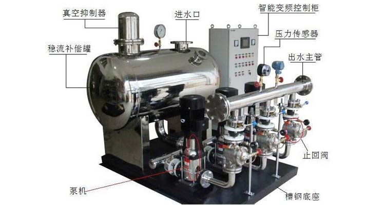 无负压变频供水设备 二次增压无塔供水设备主要由水泵机组、测压稳压罐、压力传感器、变频控制柜组成,能维持压力(即用户管网水压)等于用户设定值。