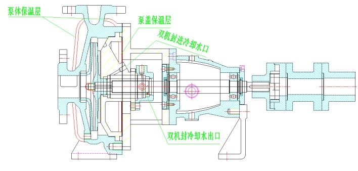 对于特殊介质, 如石蜡及易结晶液体等,这些介质只有在相对高温的情况下才能保持液态,在抽送过程中,介质很容易降温凝固致使液体无法输送,所以外面需加多一层通过高温介质(如蒸汽、导热油等)保住所输送的液体不在泵腔内结晶及凝固,使液体舒畅的通过泵输送去.